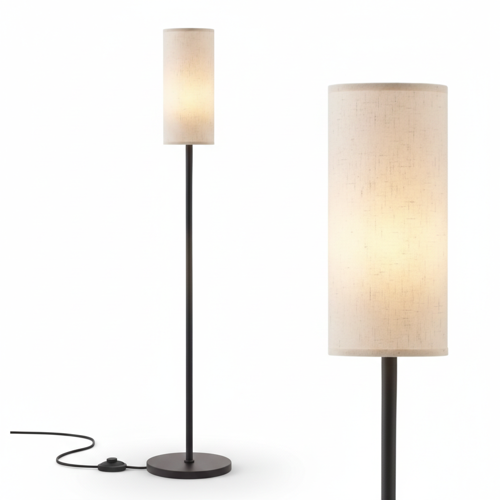 Textured Linen Shade: The cylindrical cream linen shade diffuses light beautifully, creating a soft, glare-free glow perfect for relaxation or evening focus.