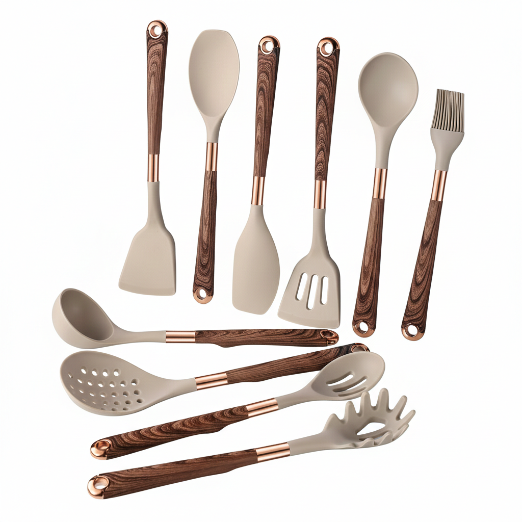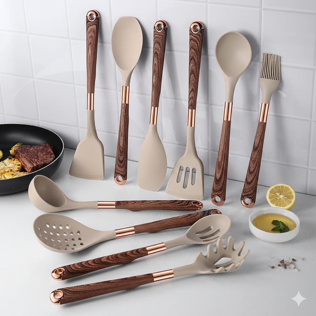 Elevate your kitchen with this premium 11 piece culinary collection. Featuring a sophisticated blend of wood-textured handles, rose gold accents, and high-quality cream silicone, The Luxe Essence Set combines modern elegance with professional performance.
